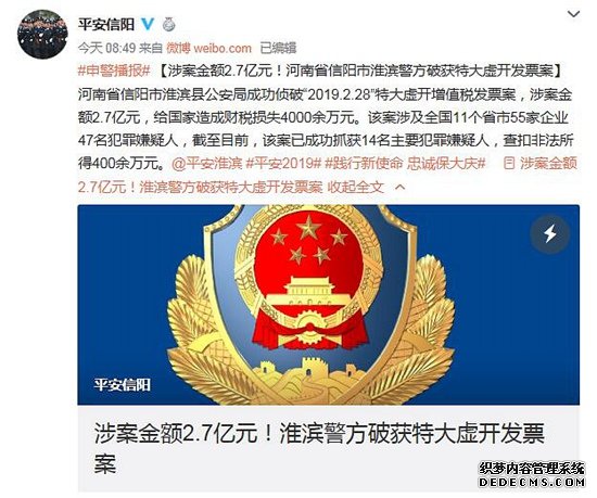 人民网郑州8月6日电(肖懿木)8月6日,信阳市公安局官方微博“平安信阳”发布消息称,信阳市淮滨县公安局于日前成功侦破“2019.2.28”特大虚开增值税发票案,涉案金额2.7亿元,给国家造成财税损失4000余万元。该案涉及全国11个省市55家企业47名犯罪嫌疑人,截至目前,该案已成功抓获14名主要犯罪嫌疑人,查扣非法所得400余万元。